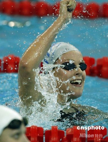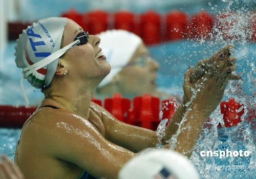 8月11日,在北京奧運(yùn)會(huì)女子200米自由泳預(yù)賽中,意大利選手費(fèi)代麗卡·佩萊格里尼以1分55秒45,破世界紀(jì)錄。中新社發(fā) 杜洋 攝