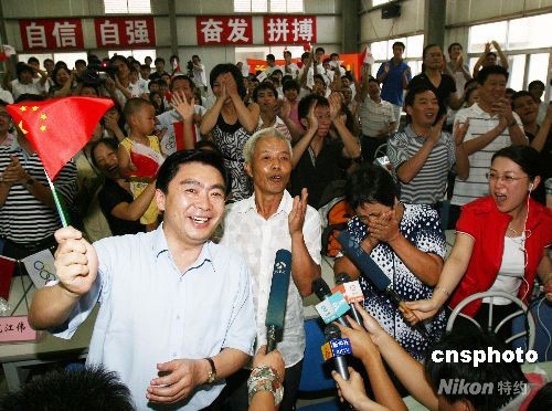 在8月11日下午舉行的北京奧運(yùn)會(huì)女子舉重58公斤級(jí)比賽中,蘇州姑娘陳艷青不負(fù)眾望,力奪冠軍,讓在蘇州觀看比賽的父母激動(dòng)萬分。 中新社發(fā) 徐志強(qiáng) 攝