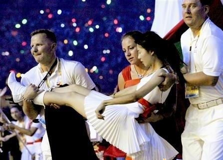 值得一提的是,當晚,有位白衣姑娘因透支體力而昏厥。在網上,一張照片記錄了這一幕:一位白衣MM不省人事,左手因抽筋痙攣而僵硬。讓人感動的是,這位姑娘暈倒在地后,第一時間抱起她的,是一位美麗的外國女運動員,兩旁還有兩位身穿白衣的外籍工作人員,一人托住她的腳,一人扶住她的頭,面露焦急,奔跑著,將姑娘送下場。這一幕,感動了無數(shù)網友,紛紛感謝這3位外國友人的熱心,并急切地搜索著他們的資料!罢嬲\的國際友誼啊!為這樣的和諧、友好鼓掌!”有網友在網上發(fā)了無數(shù)個“謝謝”來表達無法表達的謝意。