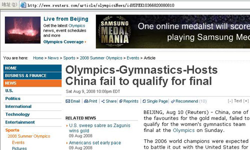 正當中國觀眾慶賀中國體操女隊史無前例地以第一名的成績挺進團體決賽的時候,地球另一邊的英國路透社卻依然沉浸在自己的黃粱美夢中。他們在比賽結束后居然發(fā)出新聞,稱中國女隊已經無緣決賽。