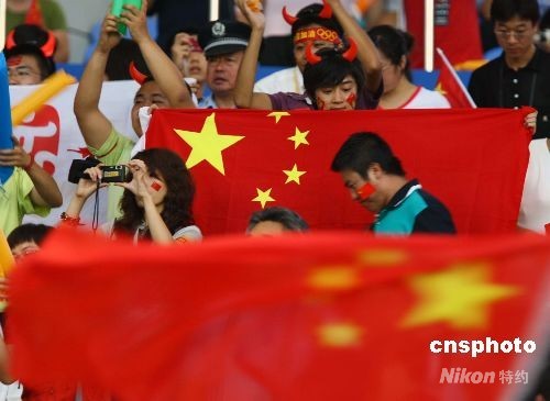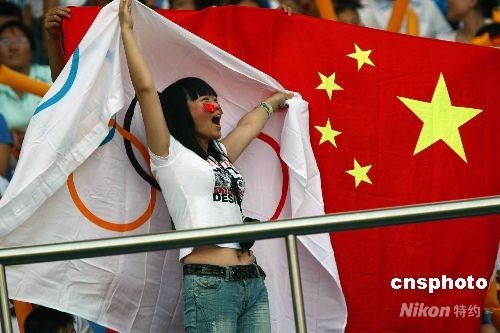 8月12日晚,北京奧運(yùn)會(huì)女足預(yù)賽,中國對阿根廷的比賽將在秦皇島奧體中心舉行,當(dāng)?shù)責(zé)崆榍蛎栽缭鐏淼奖荣悎鲳^迎接中國女足的到來。中新社發(fā) 劉新 攝