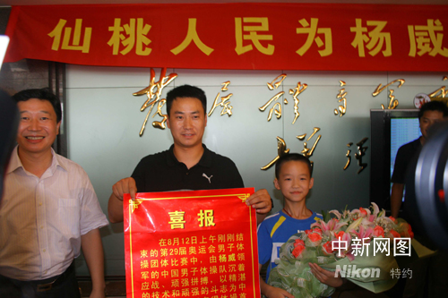楊威的姐夫謝圣武和外甥謝順是唯一留在仙桃的親屬,他們和當(dāng)?shù)孛癖娨黄鹱允甲越K關(guān)注著比賽進(jìn)程。十二時五十分左右,中共仙桃市委書記周霽將一份大紅的“喜報”交到謝圣武、謝順手中,代表當(dāng)?shù)貙钔H屬及其本人表示祝賀。周霽說,他和全市一百五十萬民眾一樣非常激動,楊威率隊(duì)贏得了這塊含金量最高的金牌,是仙桃民眾的驕傲。“更快、更高、更強(qiáng)的奧林匹克精神,已經(jīng)融入到了體操之鄉(xiāng)仙桃人的血脈中,并將激勵民眾自強(qiáng)不息,推動經(jīng)濟(jì)社會發(fā)展。”他表示。