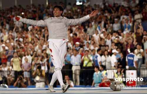 8月12日晚,08北京奧運(yùn)會(huì)男子佩劍個(gè)人賽決賽在北京國(guó)際會(huì)議中心擊劍館揭開(kāi)戰(zhàn)幕,賽會(huì)黑馬14號(hào)種子中國(guó)選手仲滿和法國(guó)選手洛佩茲在決賽中遭遇,結(jié)果中國(guó)選手仲滿以15-9戰(zhàn)勝對(duì)手獲得冠軍,這是中國(guó)男子擊劍在奧運(yùn)會(huì)上第一次獲得冠軍。 中新社發(fā) 盛佳鵬 攝