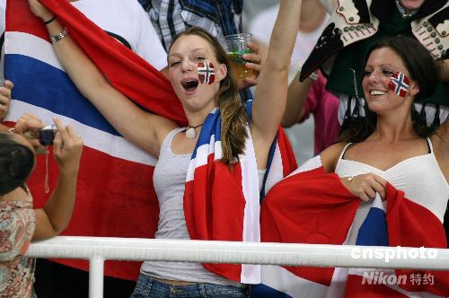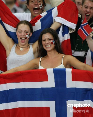 8月12日,兩位挪威美女專程趕來上海觀看奧運賽事,為挪威女足加油助威。當(dāng)日,北京奧運會女足小組賽,挪威VS日本的比賽在上海體育場進(jìn)行。 中新社發(fā) 湯彥俊 攝