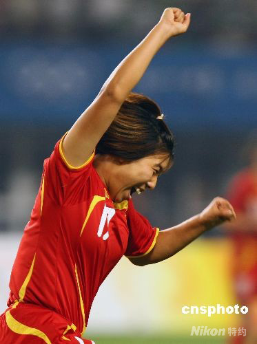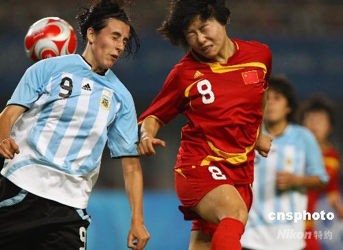 8月12日,北京奧運(yùn)會(huì)女足預(yù)賽,中國對(duì)阿根廷的比賽在秦皇島奧體中心舉行,中國女足以2:0戰(zhàn)勝阿根廷女足,以小組第一身份出線。中新社發(fā) 劉新 攝