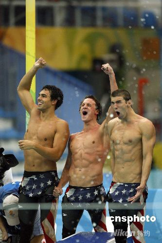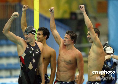 8月13日,美國隊(duì)奪得北京奧運(yùn)會(huì)男子4×200米自由泳接力決賽金牌,并打破世界紀(jì)錄。中新社發(fā) 杜洋 攝