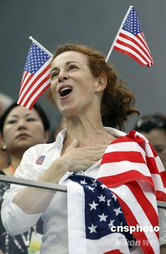 8月13日,一名美國觀眾和美國游泳隊一起高唱國歌慶祝勝利。當(dāng)日,美國隊在北京奧運會男子4x200米自由泳接力項目上,奪得金牌并刷新世界紀(jì)錄,美國運動員在“水立方”屢獲佳績,也成為美國觀眾最幸福的地方。中新社發(fā) 杜洋 攝