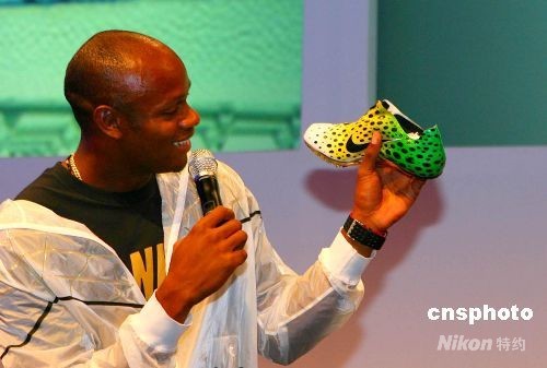 8月12日夜,世界短跑名將鮑威爾在北京發(fā)布強(qiáng)力短跑釘鞋,鮑威爾本人參與該跑鞋的設(shè)計(jì)過(guò)程。圖為他在展示該跑鞋。中新社發(fā) 沈晨 攝
