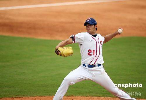 8月13日,中華臺(tái)北棒球隊(duì)在北京奧運(yùn)會(huì)棒球首場(chǎng)比賽中,以5:0完勝荷蘭隊(duì)。圖為中華臺(tái)北隊(duì)投手陳偉殷在比賽中。 中新社發(fā) 武仲林 攝