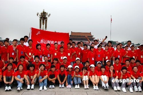 8月13日,北京天安門廣場迎來了一個特殊的群體。來自河南鄭州的百余名孤兒和來自四川災區(qū)在鄭州念書的孤兒們完成了他們的“奧運圓夢之旅”,來到天安門前興奮的合影留念。中新社發(fā) 張雙雙 攝