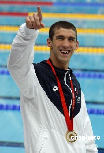 8月15日上午,在國家游泳中心水立方舉行的北京奧運(yùn)會(huì)男子200米混合泳中,美國選手菲爾普斯續(xù)寫神話,再次打破世界紀(jì)錄獲得冠軍,收取他在本屆奧運(yùn)的第六枚金牌,使得他在奧運(yùn)會(huì)上獲得的金牌總數(shù)達(dá)到12枚。中新社發(fā) 杜洋 攝