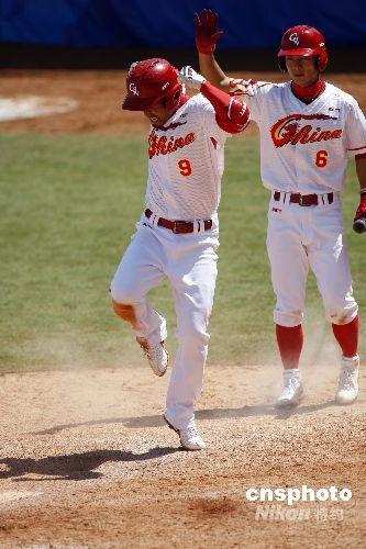 8月15日,北京奧運(yùn)會棒球男子預(yù)賽在北京五棵松棒球場舉行,中國隊(duì)對陣中華臺北隊(duì)。最終中國隊(duì)經(jīng)過四個(gè)多小時(shí)的苦戰(zhàn),以8:7逆轉(zhuǎn)戰(zhàn)勝中華臺北隊(duì)。圖為中國隊(duì)9號張玉峰(左)慶祝得分。中新社發(fā) 盛佳鵬 攝