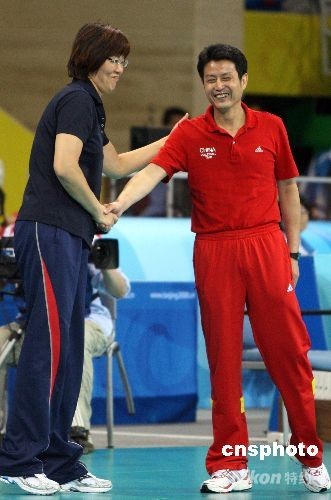 賽后,美國隊主教練郎平主動上前與中國隊主教練陳忠和握手。