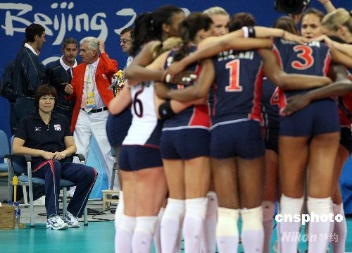 賽后,美國隊熱烈慶祝時,主教練郎平沉默地坐在一旁。