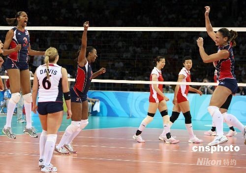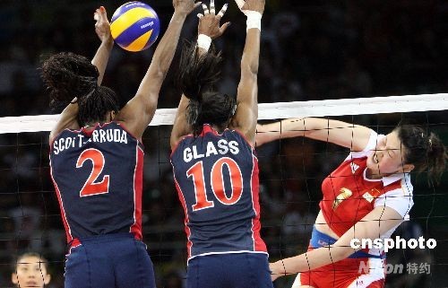 8月15日晚,北京奧運(yùn)會女排小組賽中國與美國之戰(zhàn)在北京奧運(yùn)會排球比賽館--首都體育館舉行,這場被戲稱為“和平大戰(zhàn)”的比賽最后時(shí)刻,兩名美國選手封死了中國隊(duì)王一梅的扣殺而以3比2戰(zhàn)勝中國女排。中新社發(fā) 任晨鳴 攝