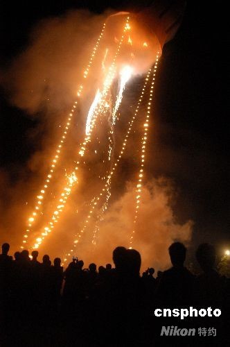 放孔明燈是海南群眾中元節(jié)的傳統(tǒng)習俗,萬寧市后安鎮(zhèn)下港村民以制作巨型孔明燈聞名。繼2007年“下港六號”孔明燈成功放飛之后,今年該村村民又打造了“下港七號”孔明燈。這個孔明燈直徑達21米,高28米,采用特制白紙1680張,重約500公斤,耗資5萬元制作而成。燈體上寫著“下港村民為中國加油”、“預(yù)祝奧運取得圓滿成功”等字樣,中元節(jié)當晚經(jīng)過兩次燃放終于成功升空。