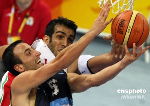 8月16日,北京奧運會男子籃球小組賽第四輪比賽在五棵松籃球館舉行,雅典奧運會冠軍阿根廷隊以97比82擊敗亞洲亞軍伊朗隊,隊中“老大”、效力于NBA馬刺隊的球星吉諾比利砍下全場最高的32分。中新社發(fā) 任晨鳴 攝