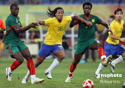 8月16日,北京奧運(yùn)會(huì)沈陽足球分賽場(chǎng)舉行男足1/4決賽,巴西隊(duì)通過加時(shí)賽,以2:0戰(zhàn)勝喀麥隆隊(duì),進(jìn)入半決賽。圖為巴西隊(duì)球員羅納爾迪尼奧(左二)帶球突破。中新社發(fā) 張宇 攝