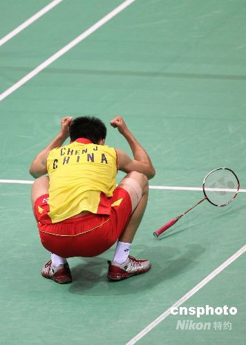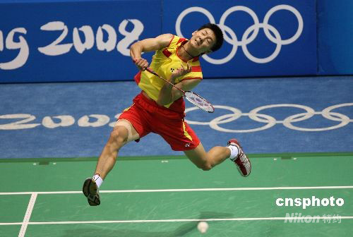 8月16日晚,中國選手陳金在北京奧運會羽毛球男子單打銅牌爭奪戰(zhàn)中以2比1戰(zhàn)勝韓國選手李炫一,奪得銅牌。中新社發(fā) 武仲林 攝