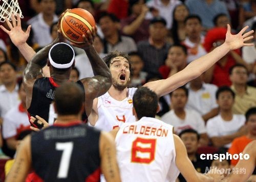 北京奧運會男子籃球小組賽第四輪比賽8月16日在五棵松籃球館舉行,同為三戰(zhàn)三勝的美國“夢八隊”、世錦賽冠軍西班牙隊,午夜時分展開驚心動魄的激情碰撞。最后美國隊以119比82擊敗西班牙隊。圖為韋德突破加索爾兄弟的防守扣籃。中新社發(fā) 任晨鳴 攝