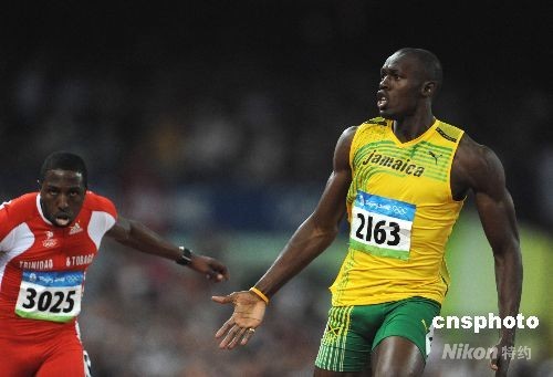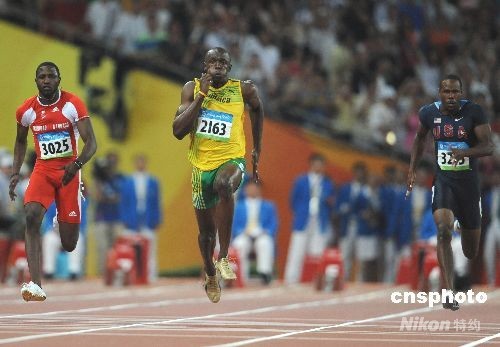 8月16日晚,牙買(mǎi)加選手尤塞恩·博爾特在中國(guó)國(guó)家體育場(chǎng)“鳥(niǎo)巢”進(jìn)行的北京2008年第二十九屆奧運(yùn)會(huì)男子100米決賽中,以9秒69的成績(jī)奪得金牌并打破9秒72的世界紀(jì)錄。中新社發(fā) 古玉 攝