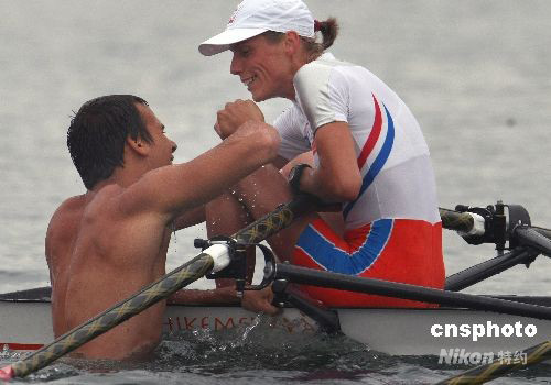 8月17日下午,荷蘭選手基爾斯滕·范德科爾卡在北京奧運(yùn)會(huì)賽艇女子輕量級(jí)雙人雙槳決賽中獲得冠軍后,男友奮身躍入水中狂游200米送上熱吻。 中新社發(fā) 任晨鳴 攝