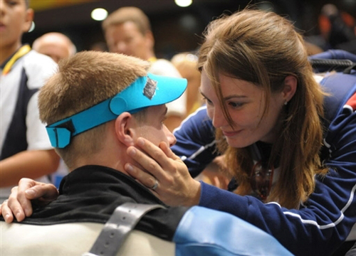 同樣的悲劇以同樣的方式,降臨到同一個人身上。在今天男子50米步槍3×40決賽的最后一輪,只要打出8環(huán),埃蒙斯就能奪冠。槍響了。4.4環(huán)!埃蒙斯把頭埋在妻子卡特琳娜的懷里,淚洗臉龐。那顆英雄的心上留下第二個悲情的彈孔。