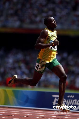 8月18日,北京奧運會男子200米預賽在北京國家體育場“鳥巢”舉行,剛拿到奧運百米冠軍的牙買加選手博爾特輕松晉級下一輪比賽。 中新社發(fā) 盛佳鵬 攝