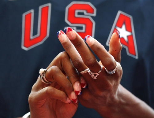 一位美國(guó)隊(duì)員在女子400米預(yù)賽的賽道上整理自己的手飾,可見這個(gè)隊(duì)員還是個(gè)“時(shí)尚先鋒”。