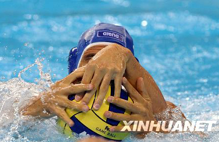 8月18日,在北京奧運會男子水球預賽中,意大利隊以13比12戰(zhàn)勝塞爾維亞隊,意大利隊球員萊奧納爾多·賓基試圖從對手手中搶球,這樣出現(xiàn)了三只手在搶球。新華社記者王慶欽攝