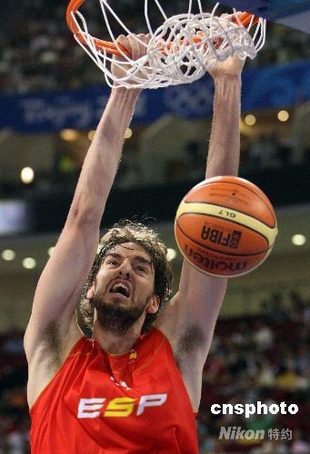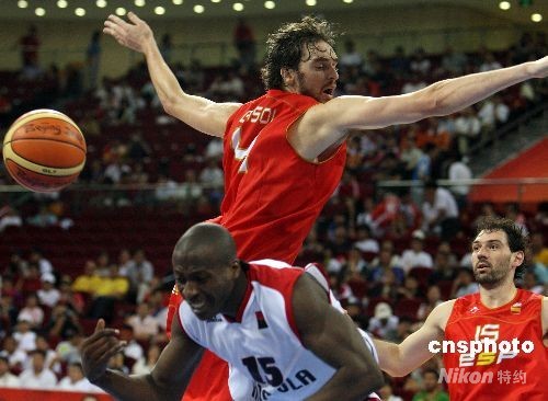北京奧運會男籃小組賽最后一輪賽事8月18日在北京五棵松籃球館舉行,此前三勝一負的世錦賽冠軍西班牙隊以98比50擊敗非洲冠軍安哥拉;安哥拉隊五戰(zhàn)五負,小組墊底。西班牙的超級巨星保羅·加索爾僅僅上場23分鐘,不僅砍下全場最高的31分,而且嚴密的防守讓對手往往無功而返,充分體現(xiàn)了“領袖氣質”。中新社發(fā) 任晨鳴 攝