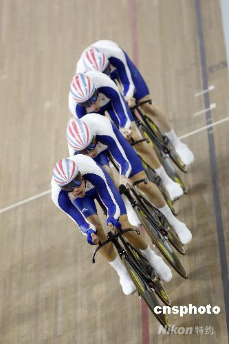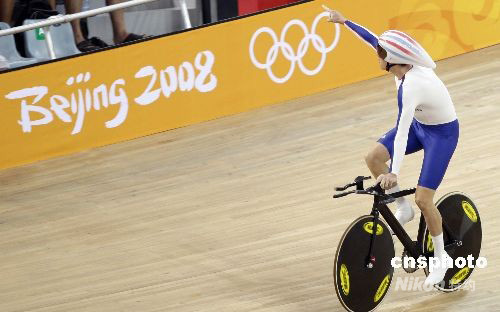 8月18日,北京奧運(yùn)會(huì)場(chǎng)地自行車(chē)男子4公里團(tuán)體追逐賽決賽在老山自行車(chē)館舉行,英國(guó)隊(duì)以3分53秒314的成績(jī)獲得金牌,打破世界紀(jì)錄。 中新社發(fā) 盛佳鵬 攝