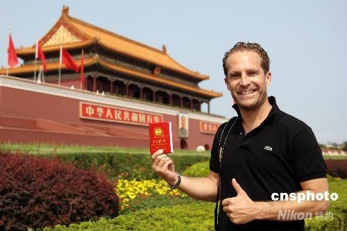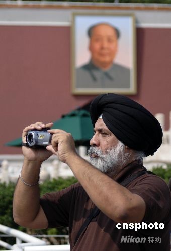 8月18日,一位前來(lái)北京觀看奧運(yùn)會(huì)的外國(guó)游客手持毛主席語(yǔ)錄在天安門前留影。中新社發(fā) 王東明 攝