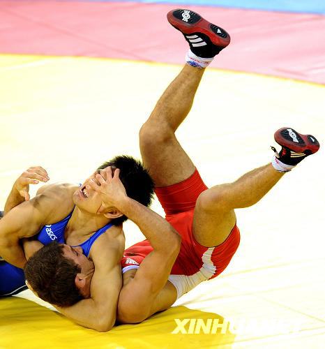 8月19日,在北京奧運(yùn)會(huì)摔跤男子自由式55公斤級(jí)半決賽中,日本選手松永共廣(藍(lán))戰(zhàn)勝俄羅斯選手別西克·庫(kù)杜霍夫,晉級(jí)決賽。新華社記者李鋼攝