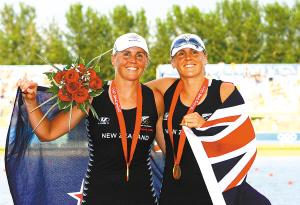 16日,新西蘭雙胞胎姐妹卡羅琳·斯溫德?tīng)柡蛦讨文取に箿氐聽(tīng)栆?.01秒的微弱優(yōu)勢(shì),驚險(xiǎn)衛(wèi)冕賽艇女子雙人雙槳冠軍。姐妹倆同時(shí)也是該項(xiàng)目世界紀(jì)錄保持者。