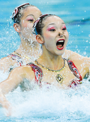 18日下午,北京奧運(yùn)會(huì)花樣游泳比賽在“水立方”迎來(lái)第一個(gè)比賽日。第一輪雙人技術(shù)自選動(dòng)作的比賽結(jié)束后,俄羅斯隊(duì)的奧運(yùn)會(huì)和世錦賽雙料冠軍達(dá)維多娃/葉爾馬科娃憑借絕對(duì)的優(yōu)勢(shì),以49.334分排在第一位,中國(guó)選手蔣文文/蔣婷婷以48.084分排在第四位。