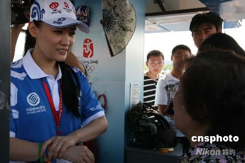 八月十九日,中國著名歌唱家譚晶在“鳥巢”八號安檢口旁的城市志愿者服務(wù)站為路人指路;钴S在北京各大場館、街道的一百七十萬各種志愿者,連日來受到國內(nèi)外各大媒體的贊揚,北京官方八月十八日也高度贊揚他們表現(xiàn)出極高的專業(yè)水準(zhǔn)。中新社發(fā) 吳慶才 攝