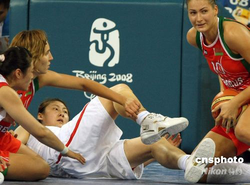圖為白俄羅斯隊三人夾擊防守中國隊卞蘭的進攻。