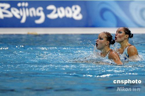 8月19日,2008北京奧運(yùn)會(huì)花樣游泳雙人自由自選預(yù)賽在國(guó)家游泳中心“水立方”進(jìn)行。衛(wèi)冕冠軍俄羅斯組合達(dá)維多娃/葉爾馬科娃以98.834的總分遙遙領(lǐng)先排名首位。 中新社發(fā) 杜洋 攝