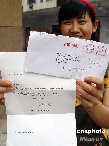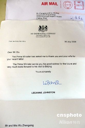 圖:英國首相布朗回函中國“奧運(yùn)夫婦”