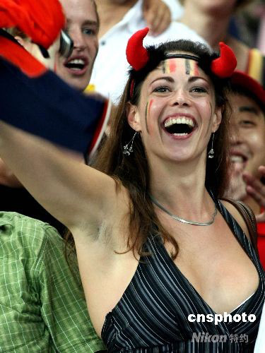 8月19日,北京奧運會男足半決賽,尼日利亞與比利時的比賽在上海體育場進行。一位比利時女球迷在觀眾席上激情助威,吸引現(xiàn)場觀眾的目光。 中新社發(fā) 湯彥俊 攝
