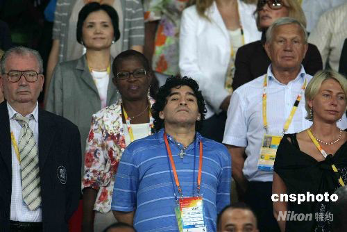 8月19日晚,北京奧運(yùn)會(huì)男足第二場(chǎng)半決賽在北京工人體育場(chǎng)舉行,球王馬拉多納到場(chǎng)觀看巴西、阿根廷兩強(qiáng)遭遇戰(zhàn)。 中新社發(fā) 任晨鳴 攝