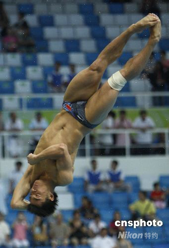 8月19日晚,在國(guó)家游泳中心“水立方”進(jìn)行的北京奧運(yùn)會(huì)男子3米跳板決賽中,中國(guó)選手何沖以572.90分奪得金牌,中國(guó)代表團(tuán)金牌總數(shù)增至43枚。 中新社發(fā) 杜洋 攝