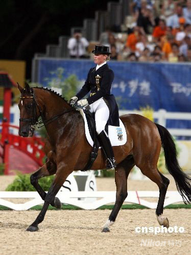 八月十九日晚,德國(guó)選手伊莎貝爾·沃思駕坐騎“薩特奇莫”在香港沙田主賽場(chǎng)舉行的奧運(yùn)馬術(shù)盛裝舞步個(gè)人賽上,獲得該項(xiàng)目金銀。中新社發(fā) 洪少葵 攝