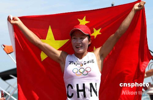 8月20日,北京2008奧運帆板比賽在青島分賽場舉行,中國四川姑娘殷劍奪得女子帆板冠軍,這也是中國代表團(tuán)在奧運會歷史上取得的第一枚帆船項目的金牌。中新社發(fā) 趙振清 攝