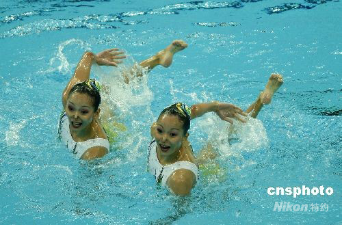 8月20日,在北京奧運會花樣游泳雙人自由自選決賽中, 中國花樣游泳“姐妹花”蔣婷婷、蔣文文排名第四,無緣獎牌。金牌被俄羅斯組合摘得。中新社發(fā) 杜洋 攝