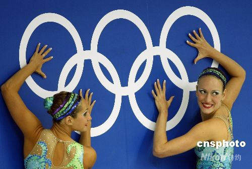 8月20日,北京奧運(yùn)會(huì)花樣游泳雙人項(xiàng)目比賽全部結(jié)束,選手賽后在“水立方”奧運(yùn)五環(huán)標(biāo)志前拍照留下靚影。 中新社發(fā) 杜洋 攝