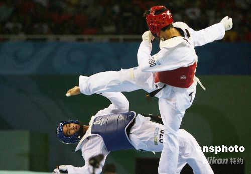 8月20日,中華臺(tái)北選手朱木炎(紅衣)戰(zhàn)勝泰國選手楚差瓦·考勞,奪得北京奧運(yùn)會(huì)跆拳道男子58公斤級(jí)銅牌。