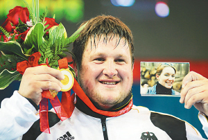 19日,男子舉重105公斤以上級的頒獎儀式上演了感人一幕:該項目冠軍、德國選手馬·施泰納把亡妻蘇珊的照片和奧運金牌高高舉起。這位德國大力士用一枚沉甸甸的奧運金牌來祭奠亡故的妻子,此情此景,令人淚下。
