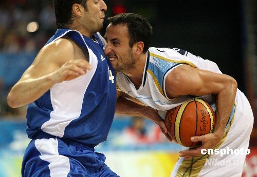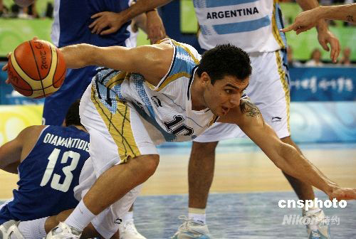 北京奧運會男籃最后一場八進(jìn)四比賽,8月20日午夜時分在五棵松籃球館舉行,南美洲冠軍、雅典奧運會冠軍阿根廷隊以80比78驚險戰(zhàn)勝歐洲勁旅希臘隊,進(jìn)入前四名。阿根廷隊將與美國“夢八隊”爭奪決賽權(quán)。隊中“老大”、在NBA馬刺隊效力的球星吉諾比利不僅砍下全場最高的24分,而且在最后時刻投中關(guān)鍵一球;另一名球星10號德爾菲諾(DELFINO Carios Francisco)砍下23分。中新社發(fā) 任晨鳴 攝